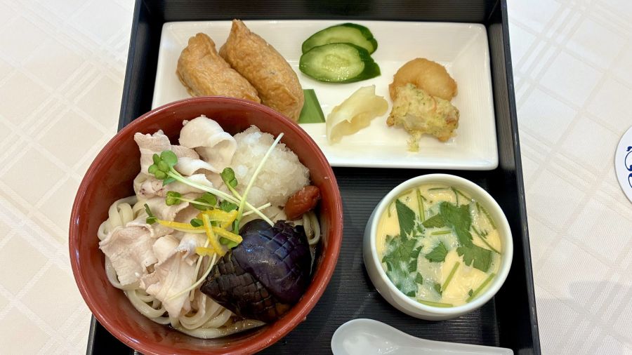 本日の昼食は、豚しゃぶ冷製うどんとお稲荷など、ボリューム満点のランチで、満腹になりながらもおいしくいただきました。