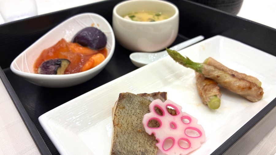 本日の昼食は焼き魚とアスパラの肉巻きなどで、魚は皮まで美味しくいただけました。