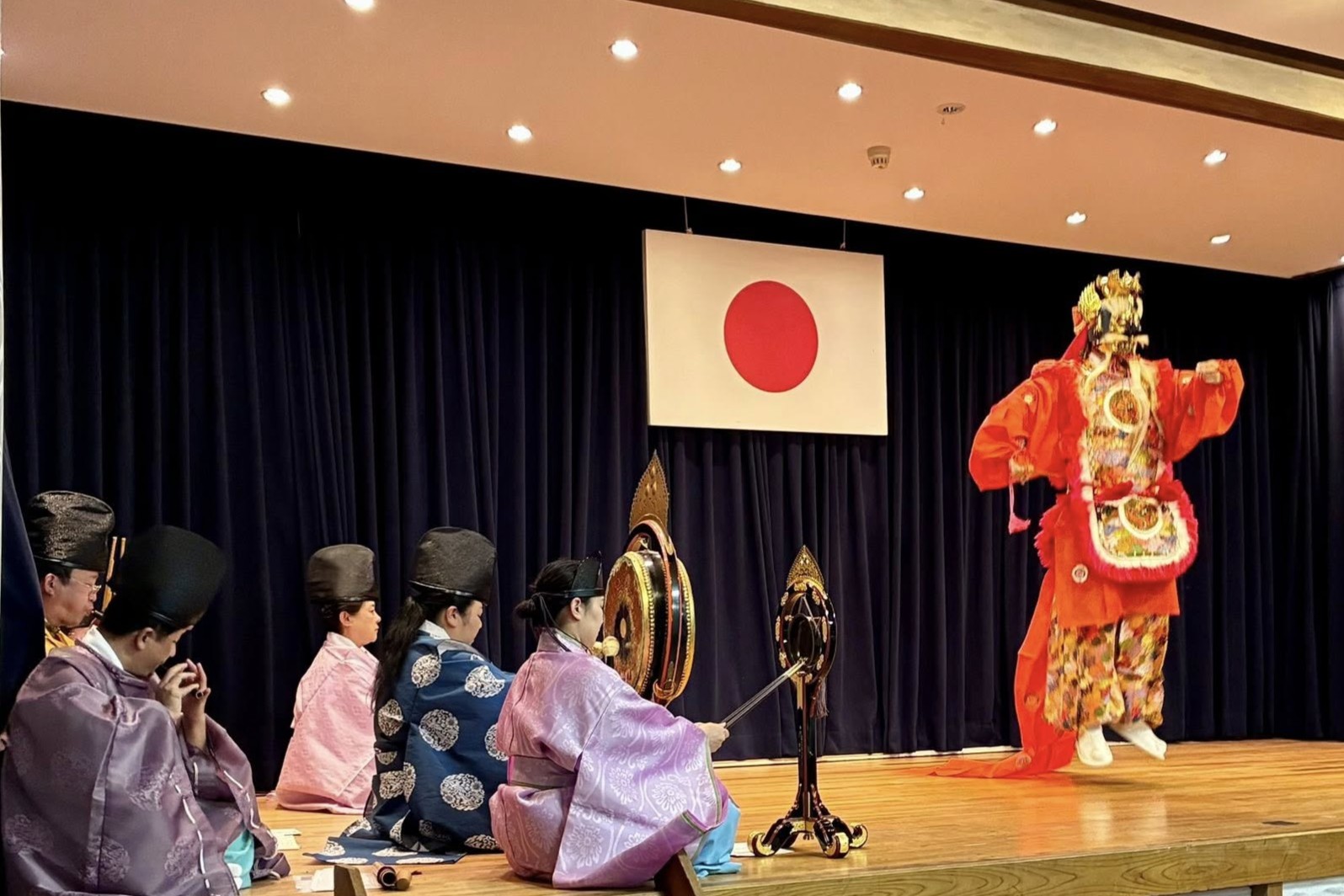 雅楽には、楽器のみで演奏される「管弦」と舞を伴う「舞楽」があり、どちらも鑑賞することができ、大変貴重な体験となりました。