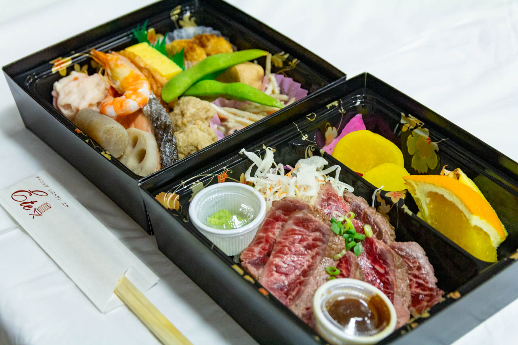 食事は「ダイニングレストラン・エテ」のお弁当で、ステーキやガーリックライスなど冷めてもとても美味しいお弁当でした。