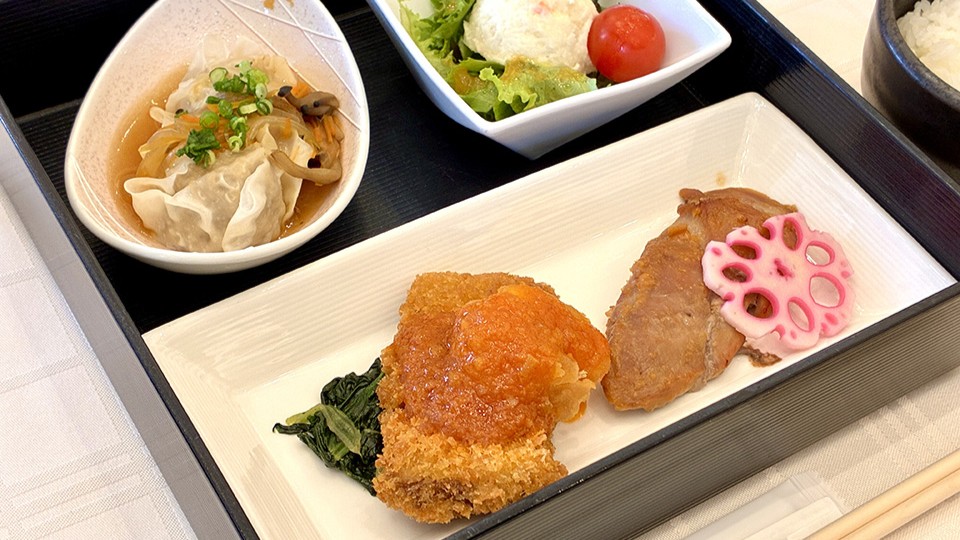 今回のランチは、チキンの味噌焼き、フライ、シュウマイなどで、美味しくいただきました。