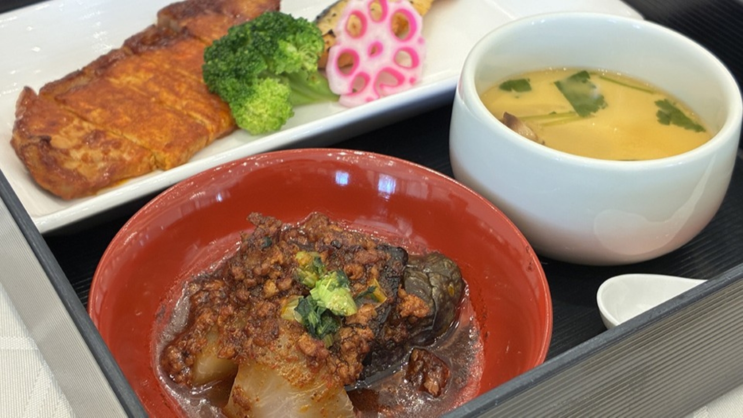 本日のランチは豚肉のカレー風味、マーボ茄子、茶わん蒸しとボリューミーなお食事でした。ごちそうさまでした。